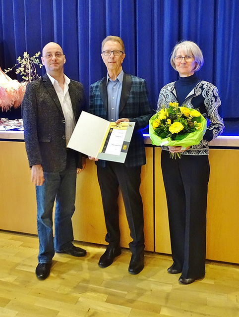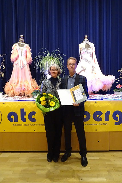 Eine große Überraschung erlebte Roland Koch in der Pause: In Vertretung für den Präsidenten des Tanzsportverbands Baden-Württemberg überreichte ihm Dominik Flaig die Verdienstnadel in Gold für 40 Jahre Mitgliedschaft und 30 Jahre Vorstand im ATC. In seiner Rede erinnerte Flaig daran, dass es Roland Koch war, der den traditionellen Tanztee ins Leben gerufen hatte, und dankte auch Anne Koch – die beiden sind das erfolgreichste Turnierpaar des Vereins – für ihren unermüdlichen Einsatz. Das Publikum quittierte die Ehrung mit einem kräftigen Applaus und am Ende des kurzweiligen Nachmittags machten sich alle beschwingt auf den Heimweg – mit der festen Absicht, sich die Veranstaltung auch im nächsten Jahr nicht entgehen zu lassen!